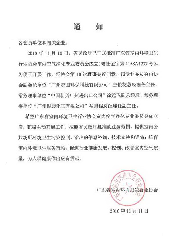 據(jù)廣東省室內(nèi)環(huán)境衛(wèi)生行業(yè)協(xié)會2010年11月11日通知,我司總經(jīng)理馬鵬程先生擔(dān)任廣東省室內(nèi)環(huán)境衛(wèi)生行業(yè)協(xié)會室內(nèi)空氣凈化專業(yè)委員會副主任一職。 通知內(nèi)容如下: