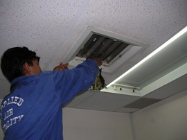 工程人員正在清洗回風(fēng)口柵格 風(fēng)管的清理