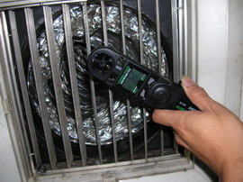 在風(fēng)管開一個(gè)洞以便將機(jī)器人放入風(fēng)管進(jìn)行清洗 銀康處理后測量風(fēng)速,以確保工程質(zhì)量