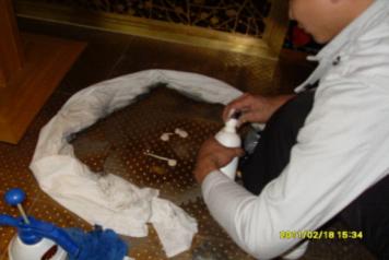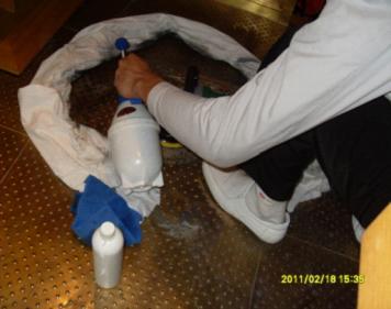 場(chǎng)地保護(hù):因施工打磨時(shí)會(huì)產(chǎn)生少量揚(yáng)塵和濺沫,故用舊布圍住四周作好防護(hù),減輕對(duì)非工作區(qū)域的影響。